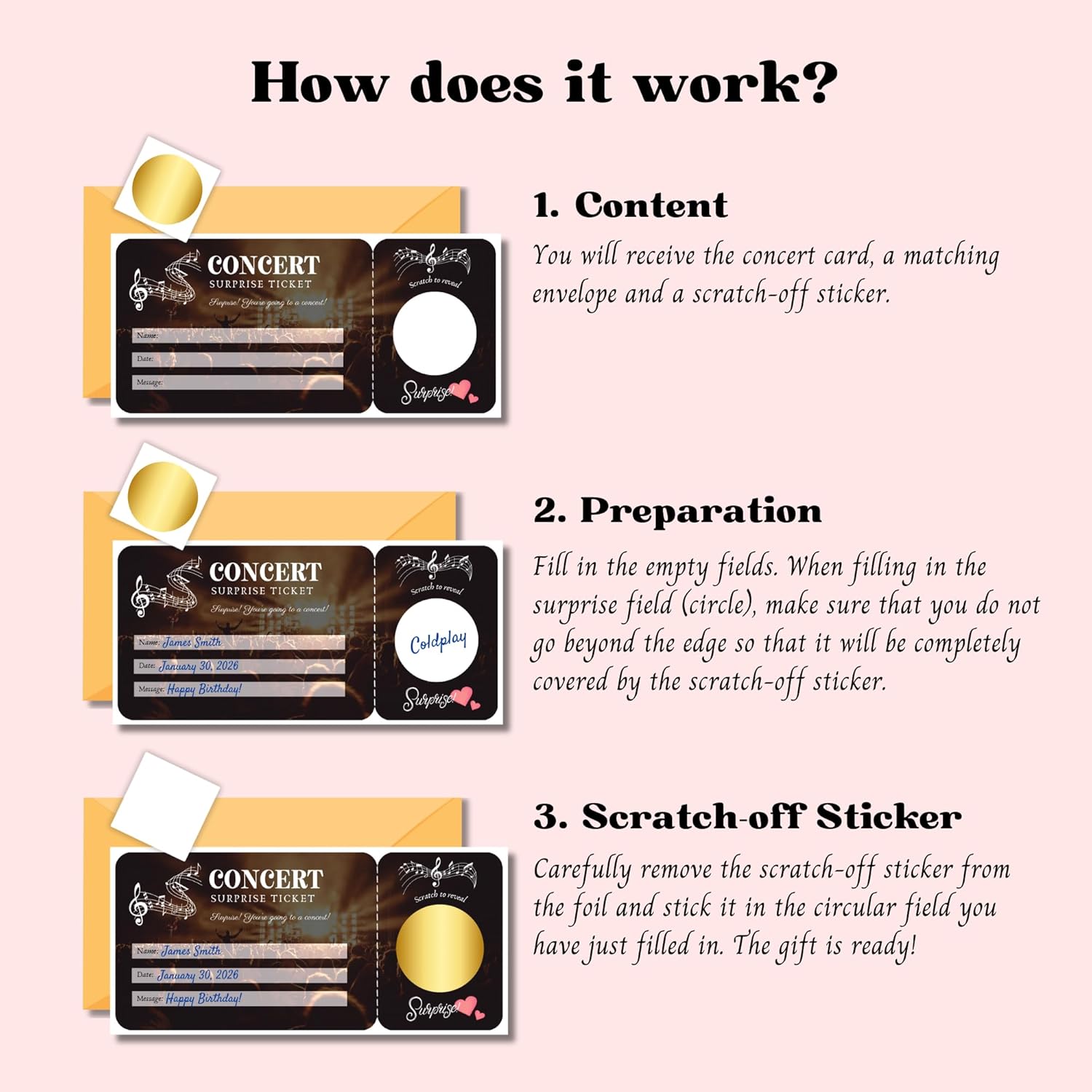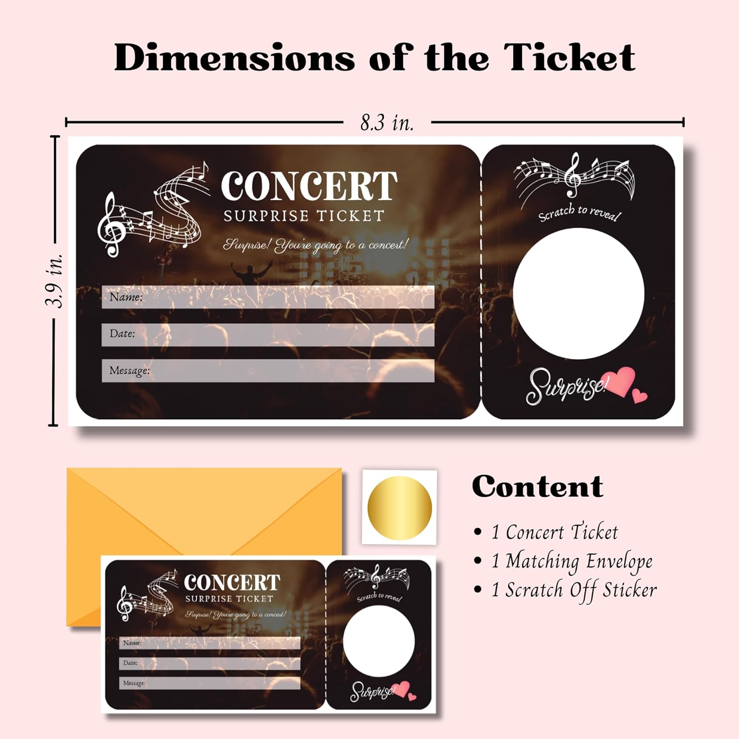 - SURPRISE CONCERT TICKET: This scratch and reveal card is a very special and fun way to reveal a surprise concert. This personalized gift card can also be kept as a souvenir and can also be used as decoration.