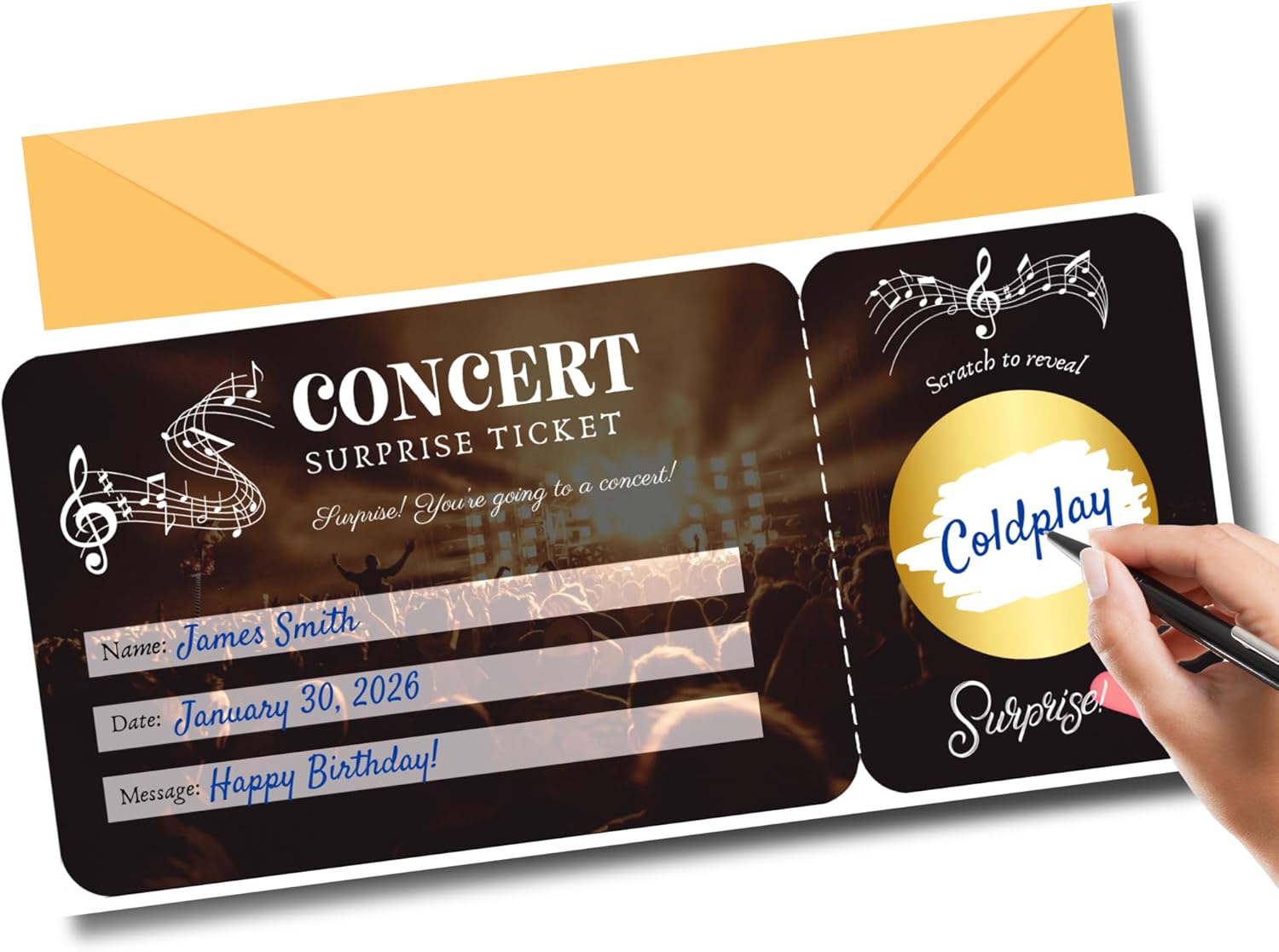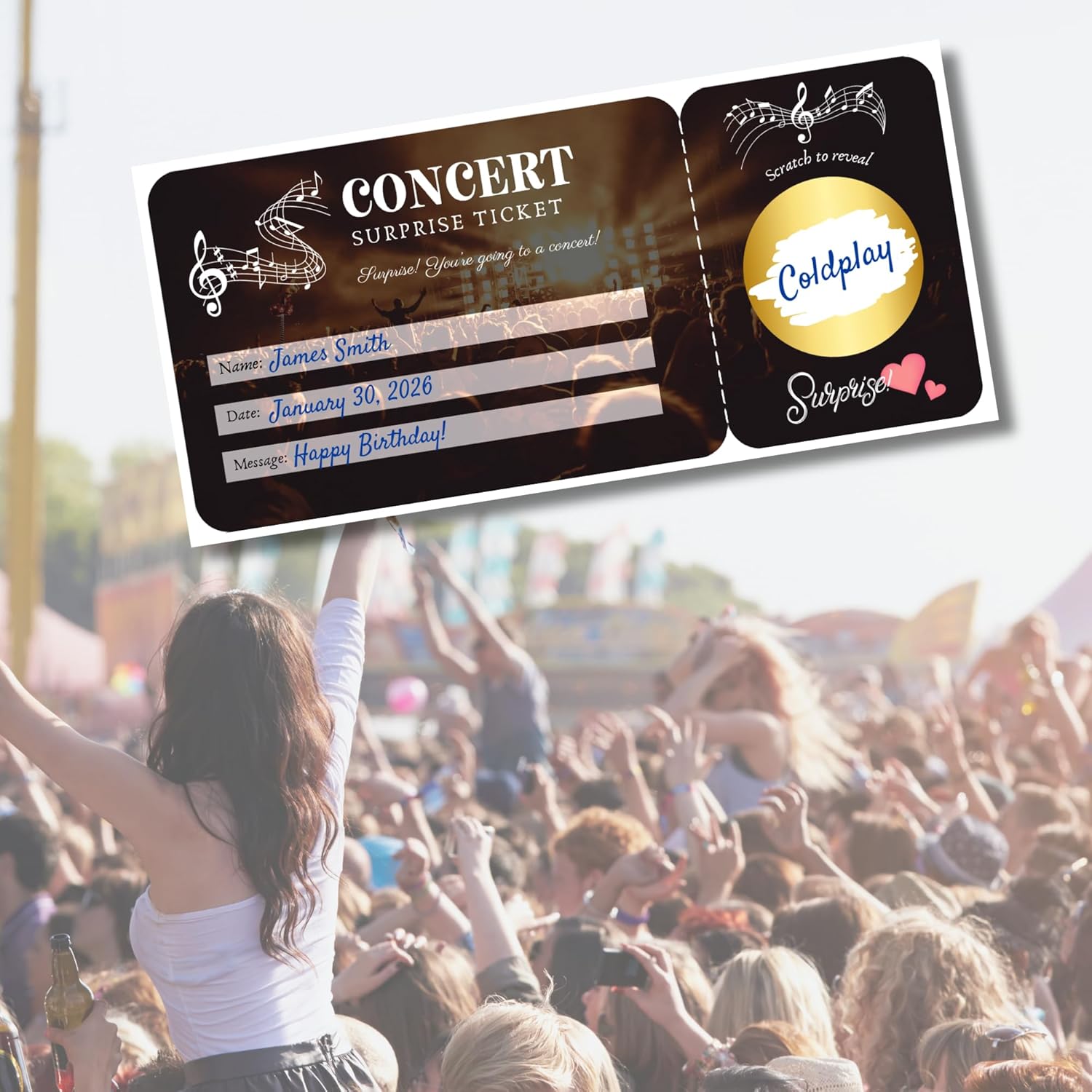 Check Price NowThe Concert Ticket Surprise is a unique and engaging gift that's perfect for surprise events. It's a custom scratch off card that can âŁbe tailored to any occasion, making it ideal for music lovers. Whether for birthdays, Christmas, or any other celebration, this product is sure to create a⢠memorable and fun gift-giving â˘experience. â Buy Now on Amazon