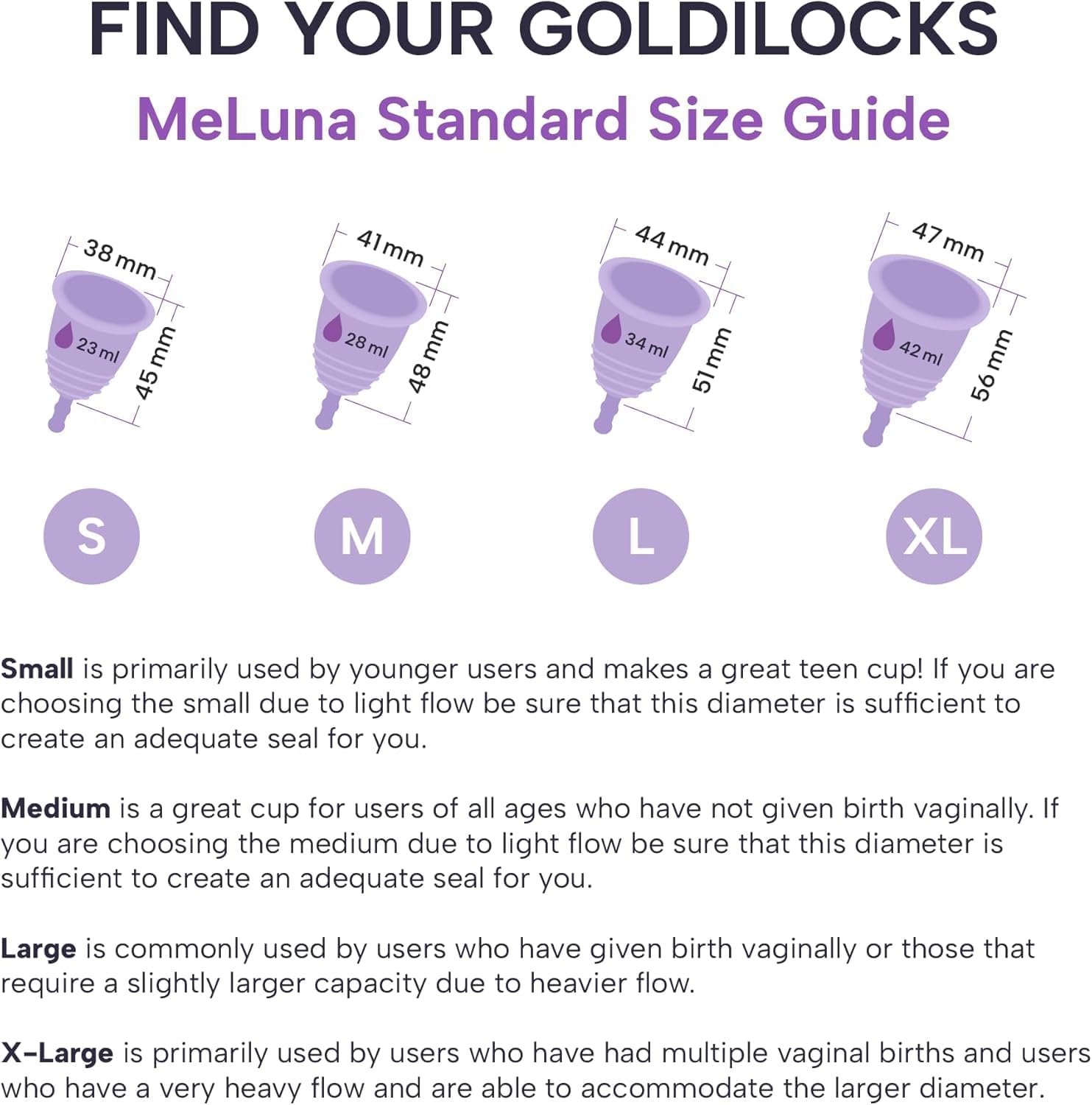 FIND YOUR PERFECT FIT. MeLuna offers the most custom-fit period cups on the market, with 4 diameters, 2 firmness options, regular and low-cervix height ranges, and 3 handle styles. MeLuna offers the perfect cup for teens, adults, and all body types.